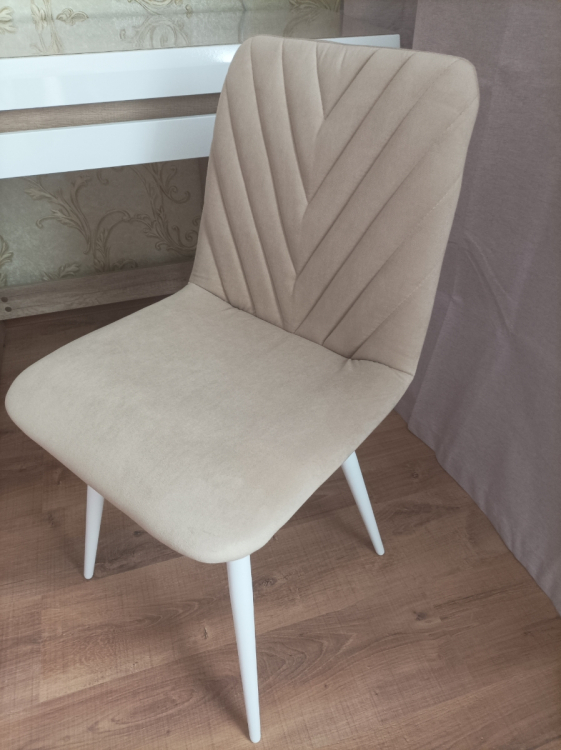 Стул отличного качества, основание и ножки металлические цельные белого цвета, сидение и спинка обиты велюром бежевого цвета (камера цвет передала неправильно, на самом деле темнее немного). Исполнение аккуратное и качественное, но сидение жёсткое. и ещё, обратите внимание, высота сидения выше стандартного размера, примерно 50 см, ни к каждому столу можно сесть.