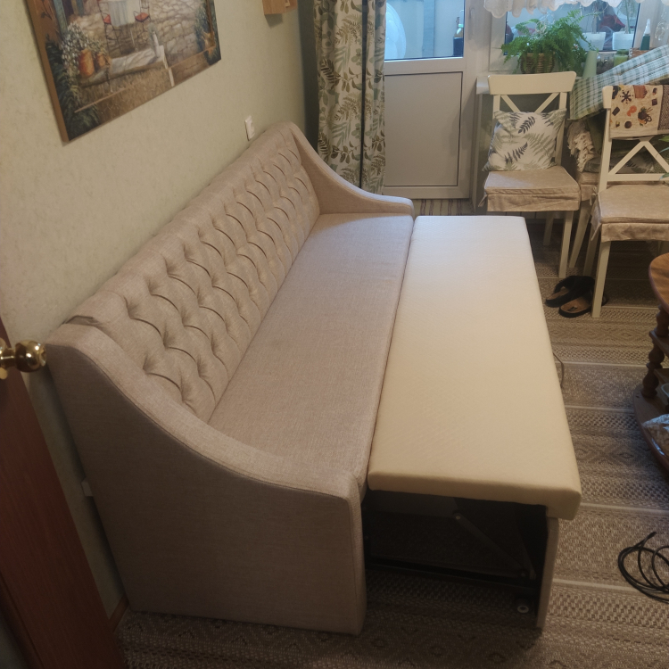 Материал обивки: микровельвет.Хороший диван за свои деньги, долго искали такой узкий, но при этом раскладывающийся диванчик на кухню. С учётом доставки транспортной компанией вышло дешевле чем купить такой же имеющийся в налии в магазине Казани, при этом здесь на сайте можно выбрать расцветку и материал. 4 звезды за то что пришлось подождать и подстраиваться под доставку ТК и отсутствием товара на складе, а сказали об этом только после оплаты.