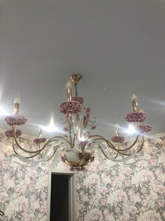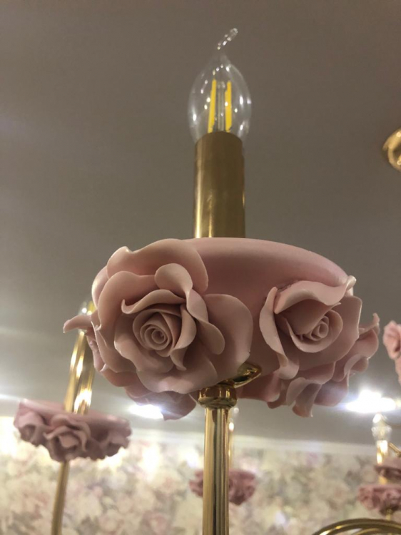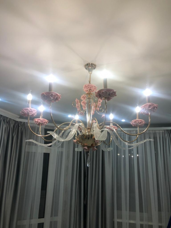 Очень красивая, необычная люстра при своей достаточно невысокой цене, китайцы молодцы! Очень большая, при высоте потолков ниже 290 см брать не стоит. При 290 см. убрали цепь, но все равно низковато висит. Очень ярки свет при использовании рекомендуемых ламп, зал освещен во всех углах. Изящные цветы, основа золотая и очень яркая, на это стоит обратить внимание. Украшает комнату и заполняет собой пространство, для маленьких комнат не подойдет.